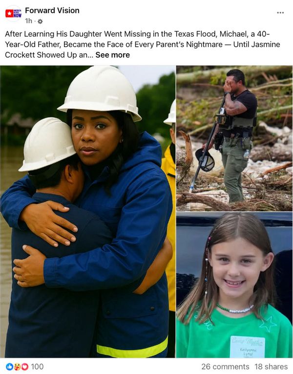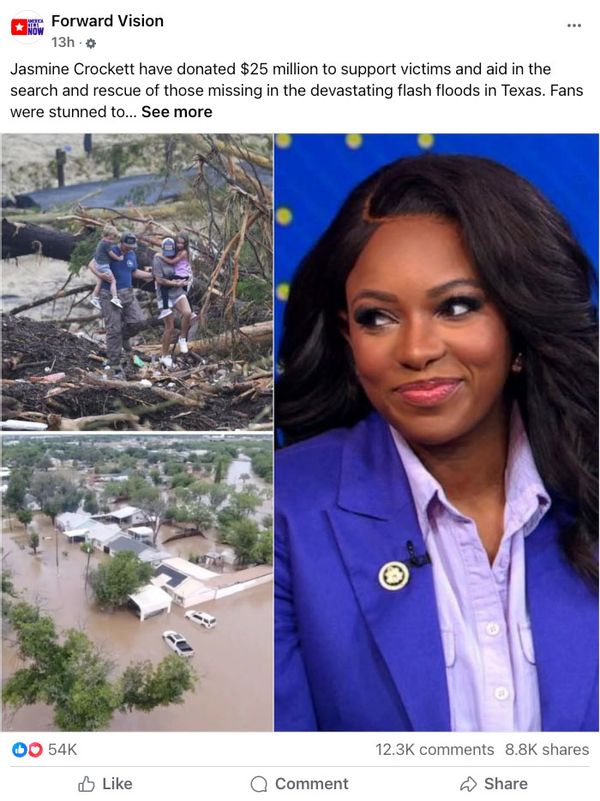 For example, on July 6, a manager of the Forward Vision Facebook page posted (archived), “Jasmine Crockett have [sic] donated $25 million to support victims and aid in the search and rescue of those missing in the devastating flash floods in Texas. Fans were stunned to learn that she personally traveled to the disaster site to offer hands-on help. Details in comment.” The post received over 54,000 reactions, as of this writing.